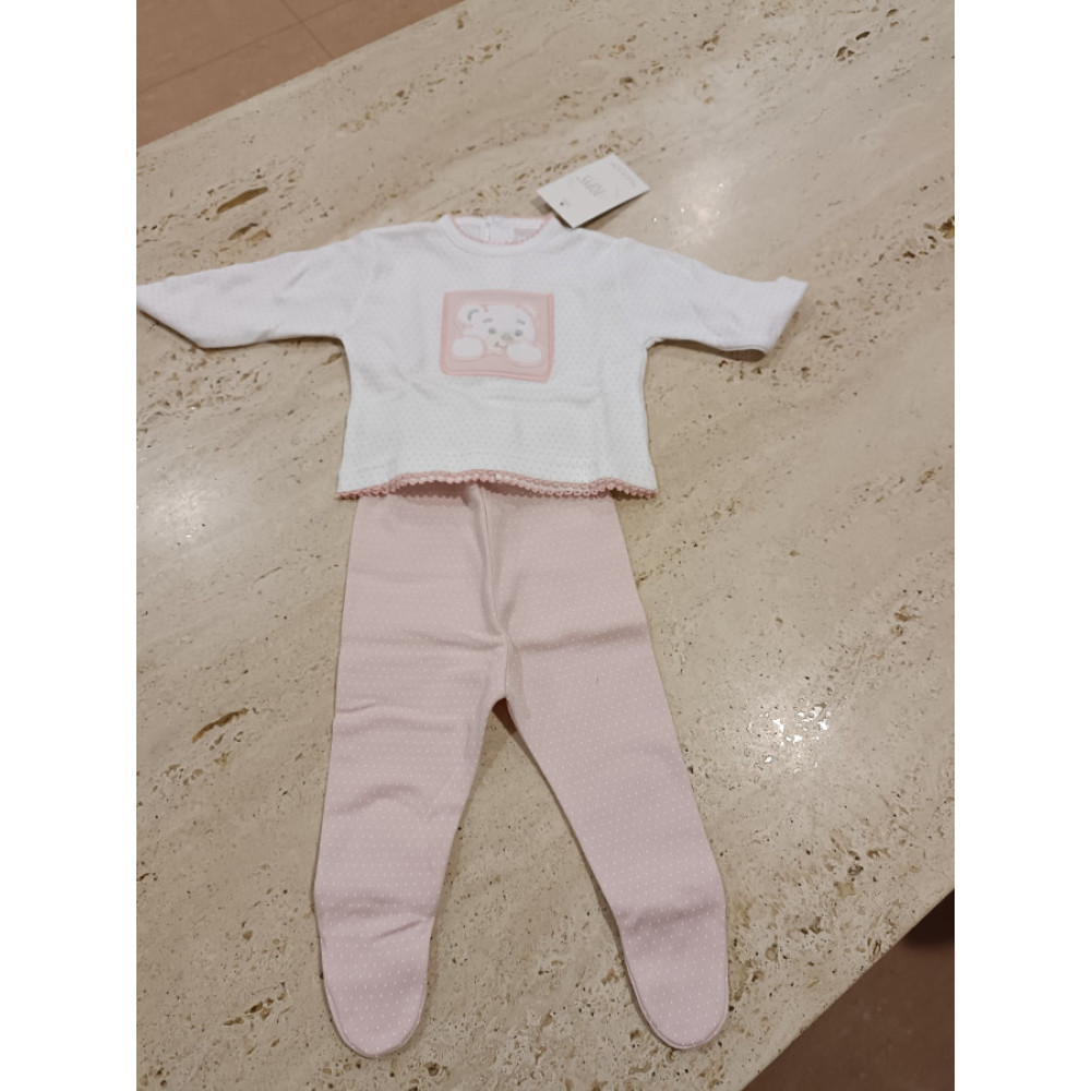 Conjunto primera puesta de dos piezas: Camiseta blanca con puntitos rosas y botones traseros. Polaina rosa con puntitos blancos. Marca Popys.