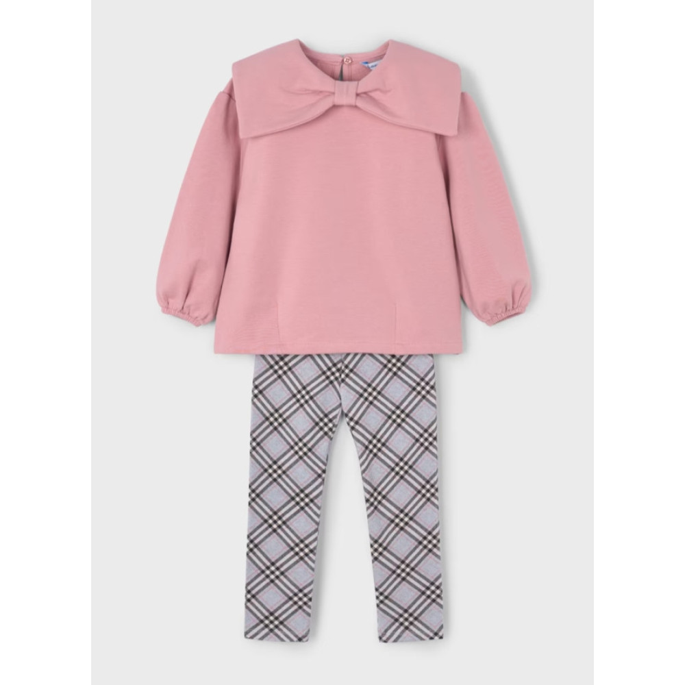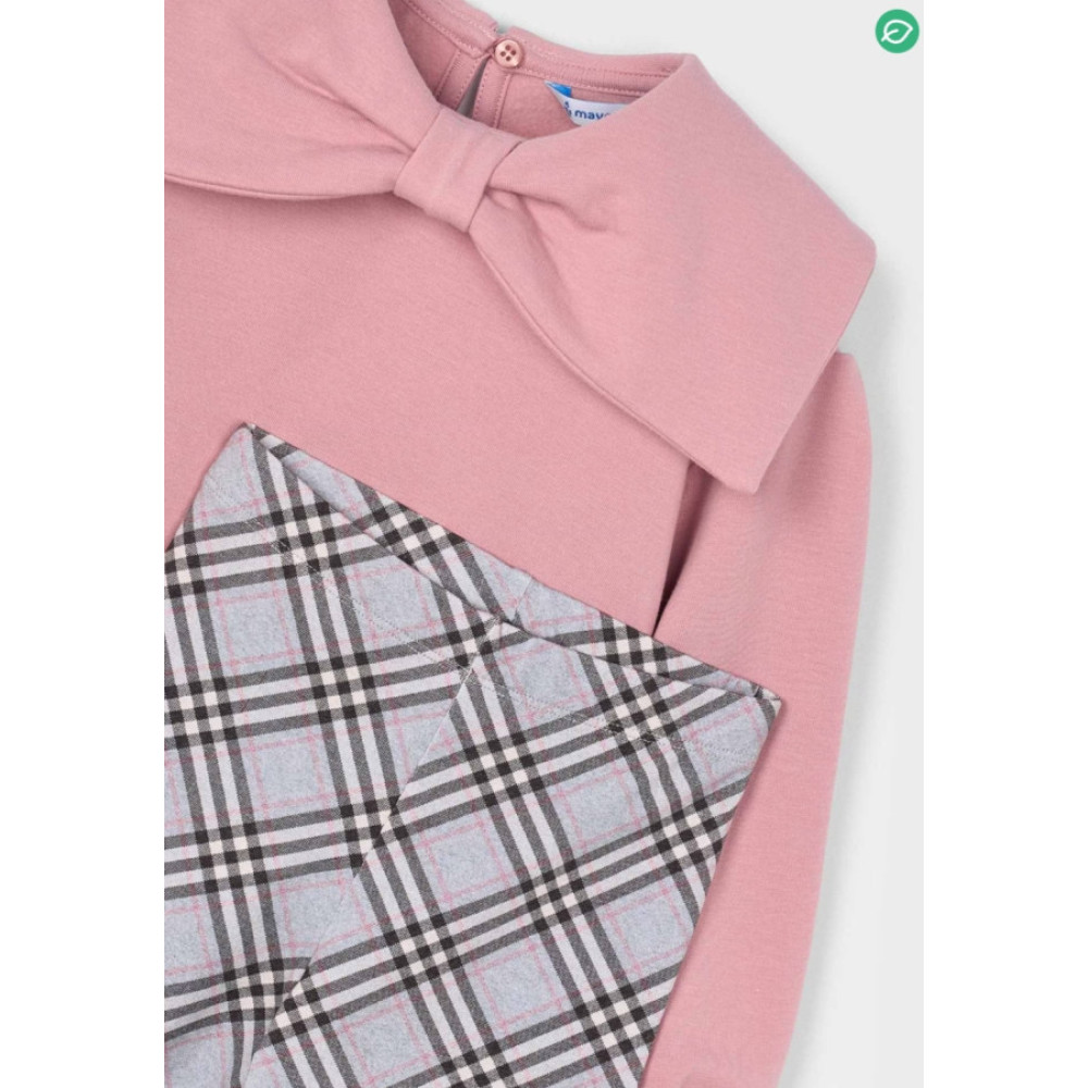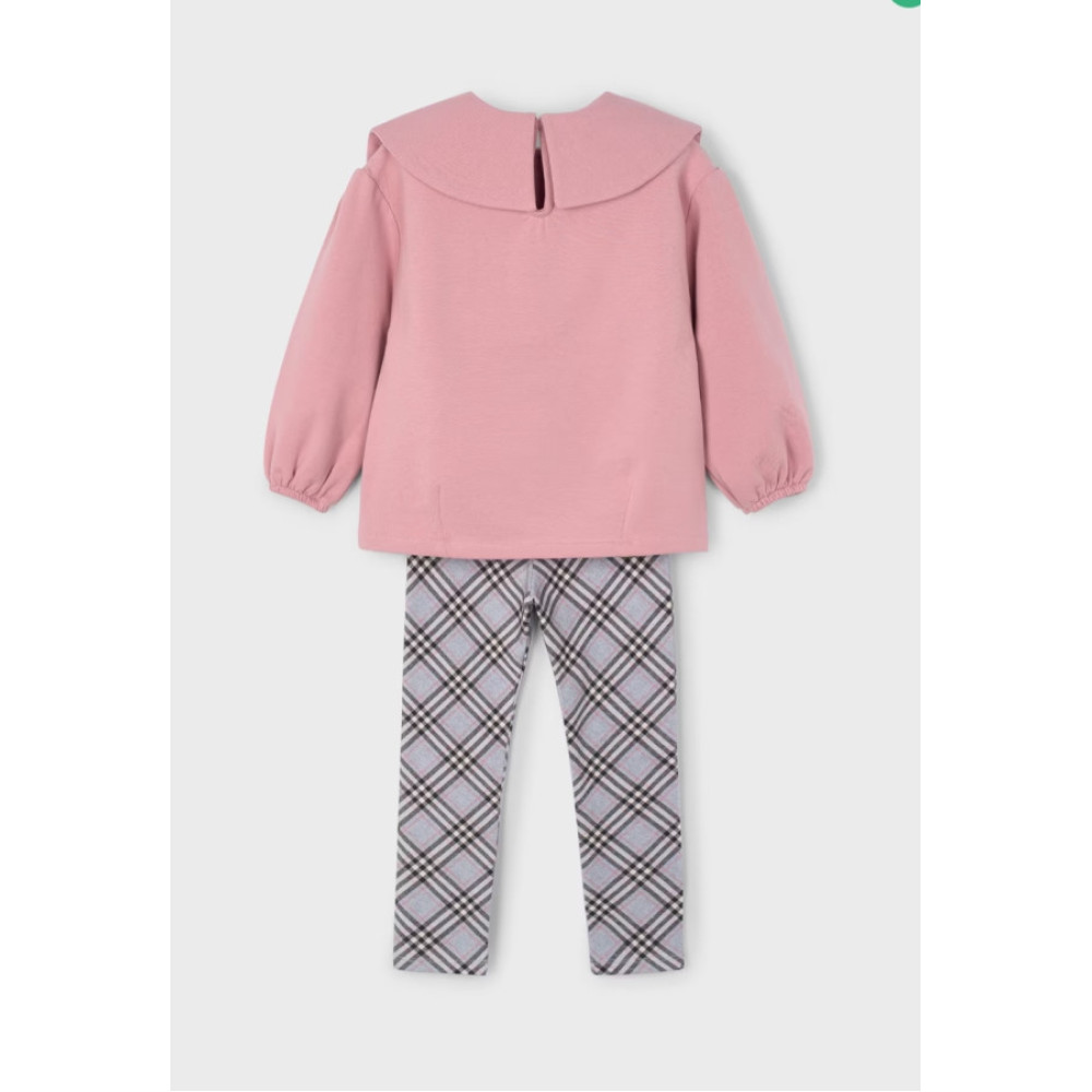 Conjunto dos piezas: Pullover de manga larga con gran solapa en cuello y leggins a cuadros largos. Marca Mayoral.