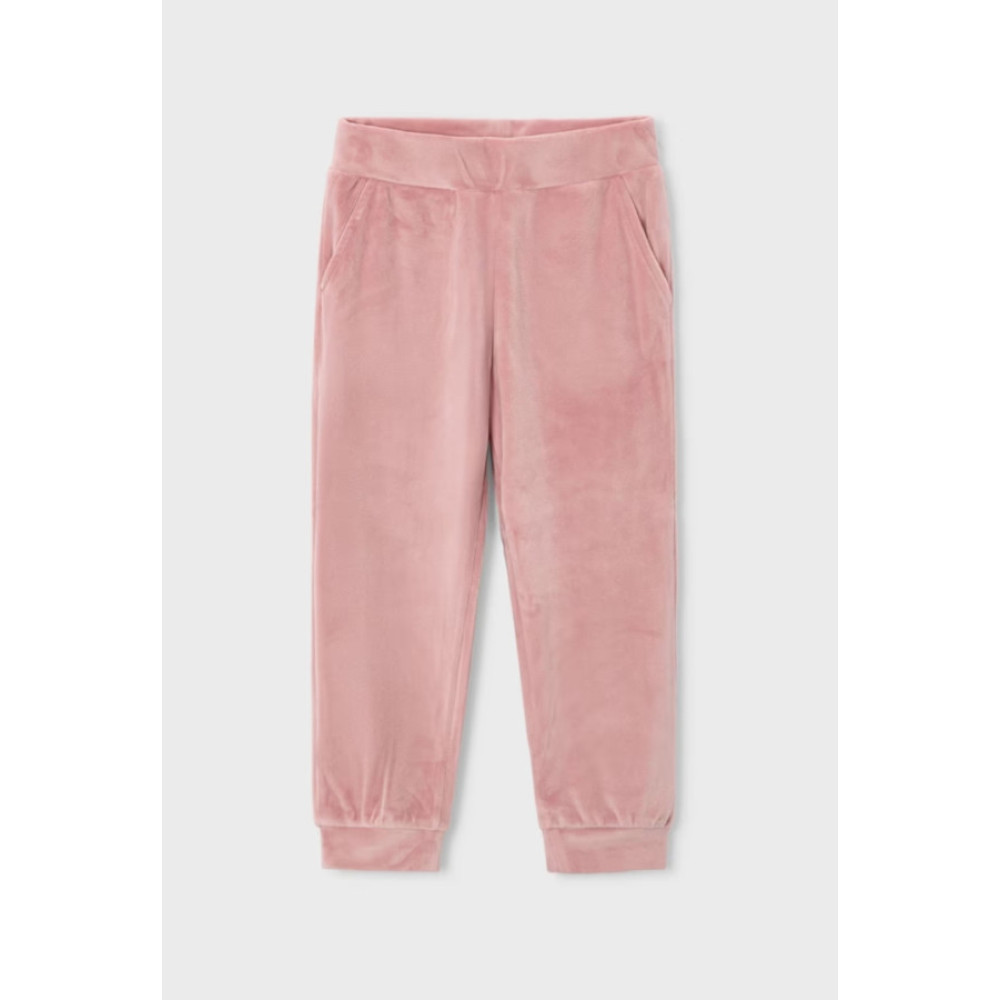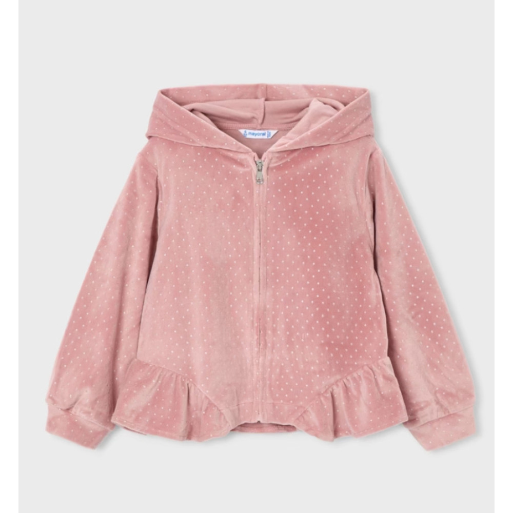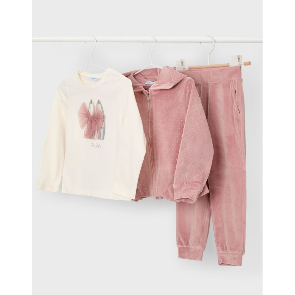 Chandal terciopelo tres piezas: Chaqueta con capucha, camiseta de manga larga y pantalón largo. Marca Mayoral.