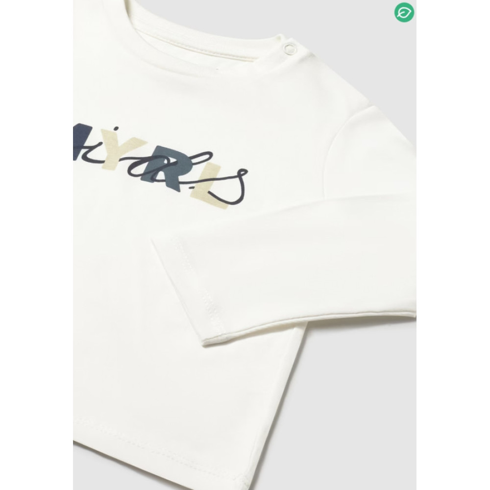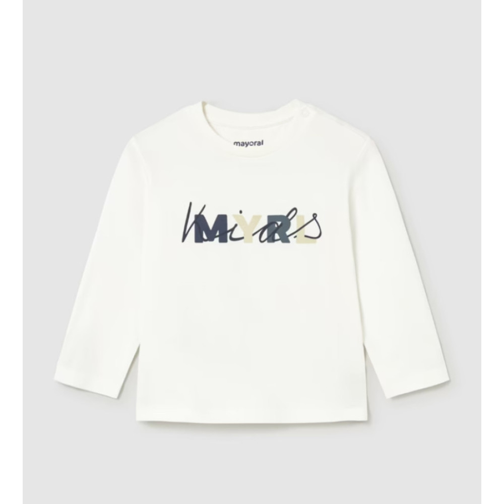 Camiseta de manga larga con cuello redondo y estampado delantero. Botones en hombro izquierdo. Marca Mayoral.