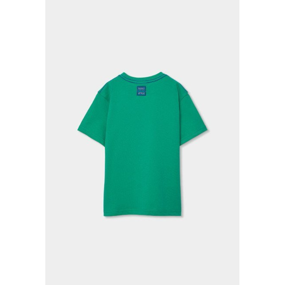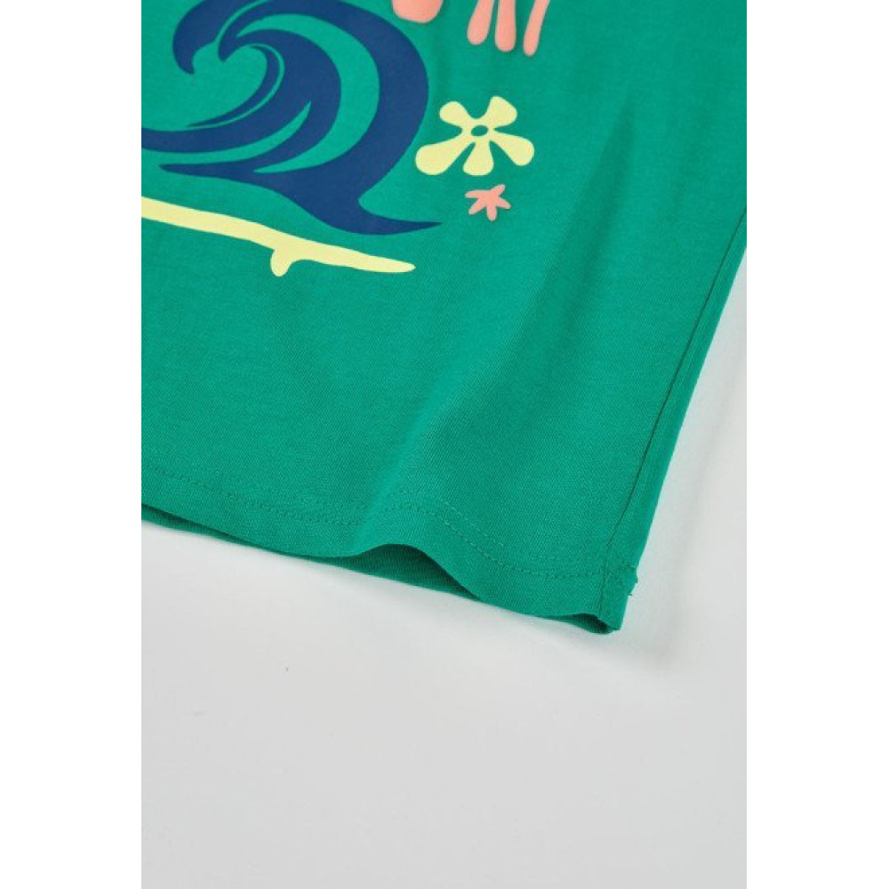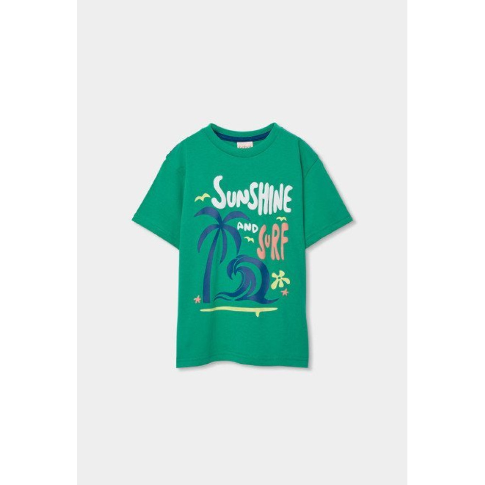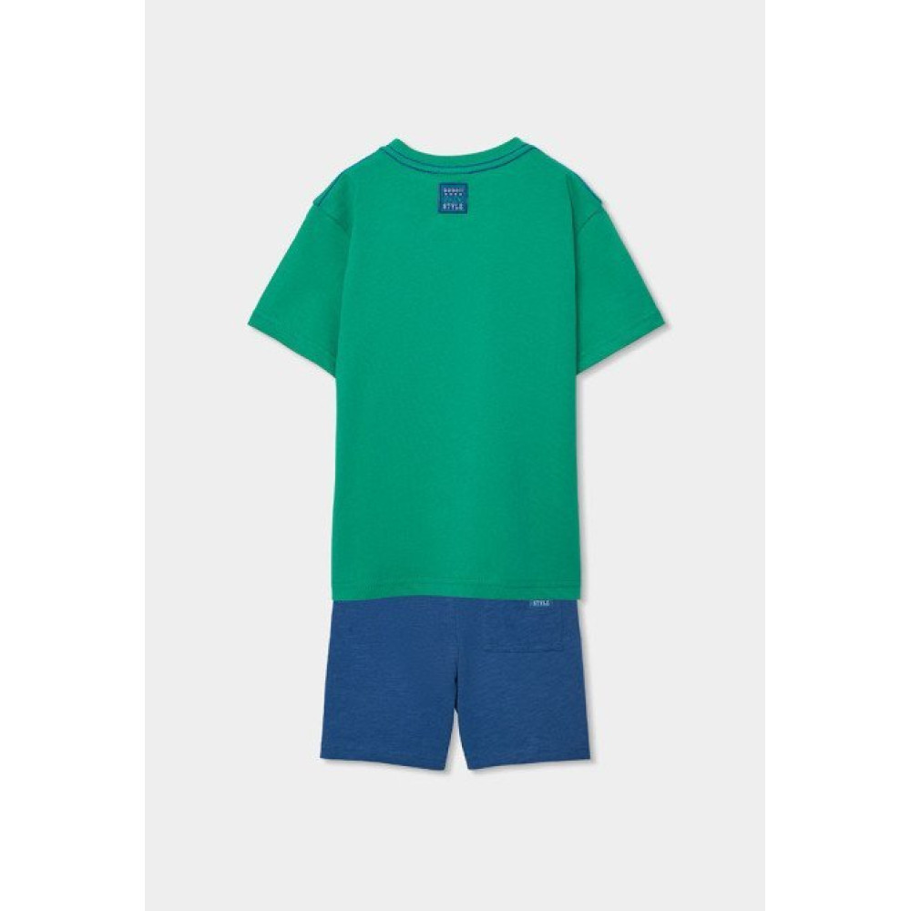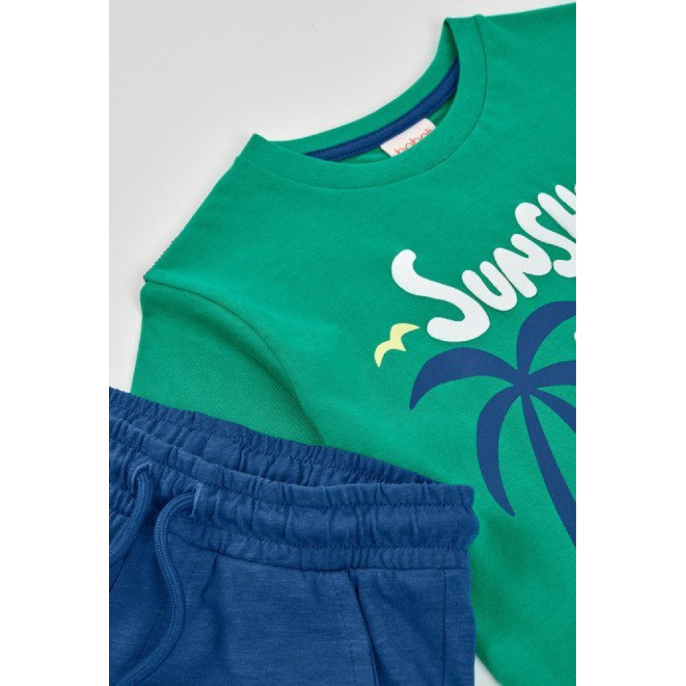 Conjunto sport de dos piezas compuesto por una camiseta de manga corta con estampado veraniego en la parte delantera y pantalón corto. Marca Boboli.