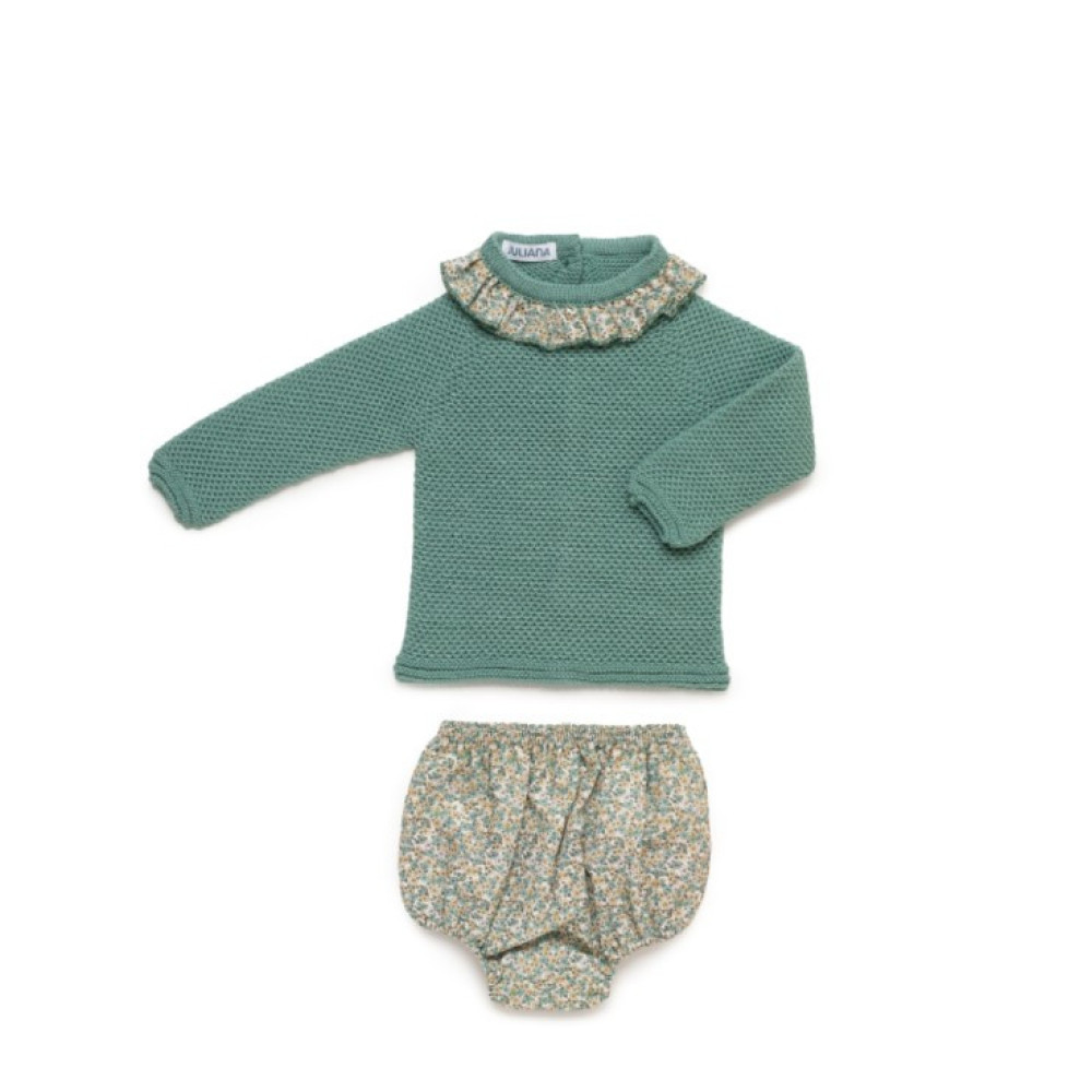 Conjunto dos piezas: Jersey en punto verde hoja con textura panal y cuello volante en tejido floral coordinado. Ranita a juego con el mismo estampado floral. Marca Juliana.