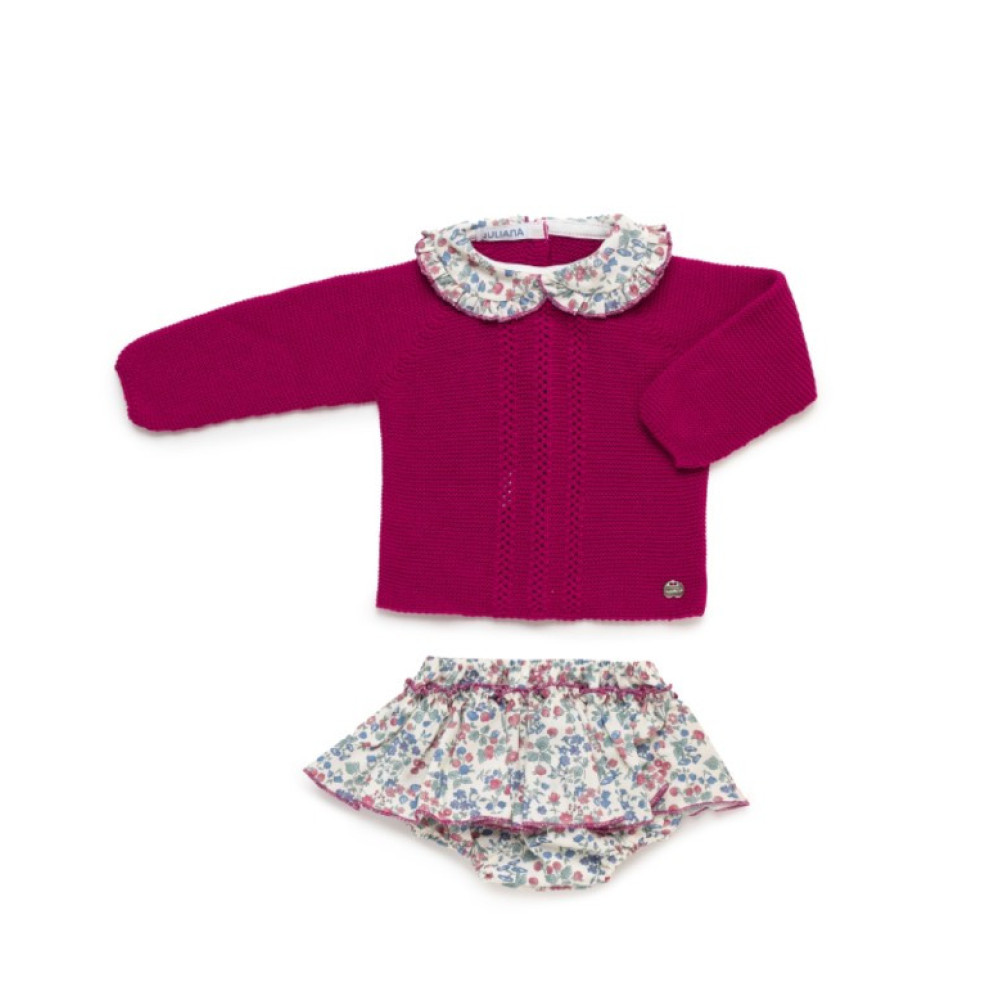 Conjunto dos piezas: Jersey de punto calado en color fucsia con cuello redondo en tejido estampado floral a tono. Ranita con volante confeccionada en la misma tela de flores, rematada con rizo fucsia. Marca Juliana.