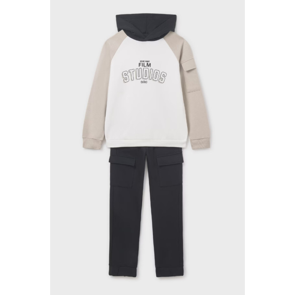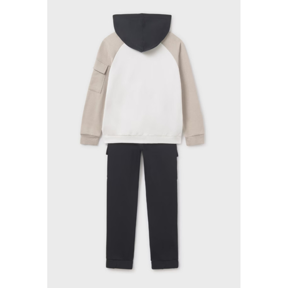 Chandal dos piezas: Sudadera con capucha y bolsillo en manga izquierda y pantalón largo. Marca Mayoral.