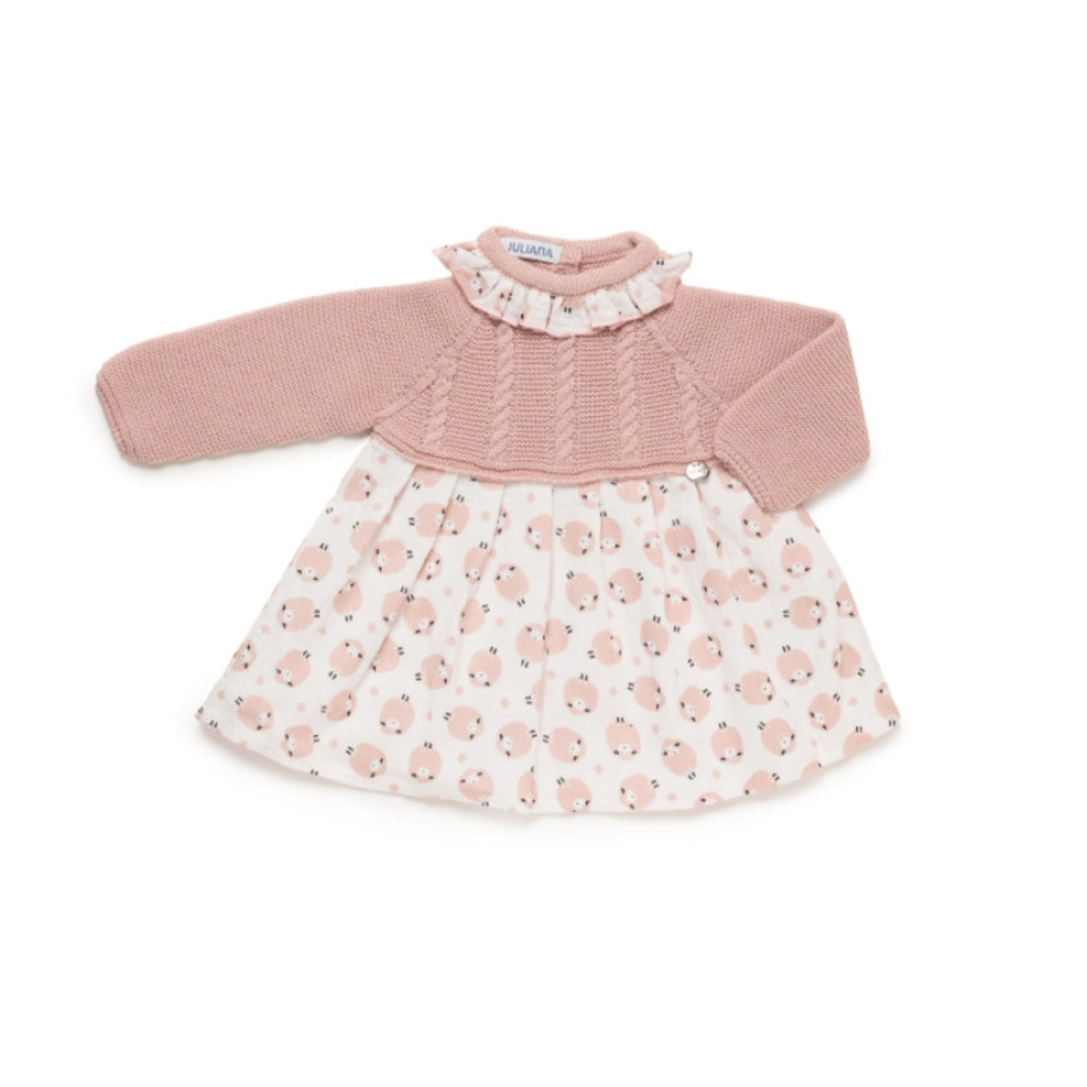Vestido de punto tricot con delicado calado central en el cuerpo. La falda es de muselina blanco con un simpático estampado de ovejitas, a juego con el volante. Marca Juliana.