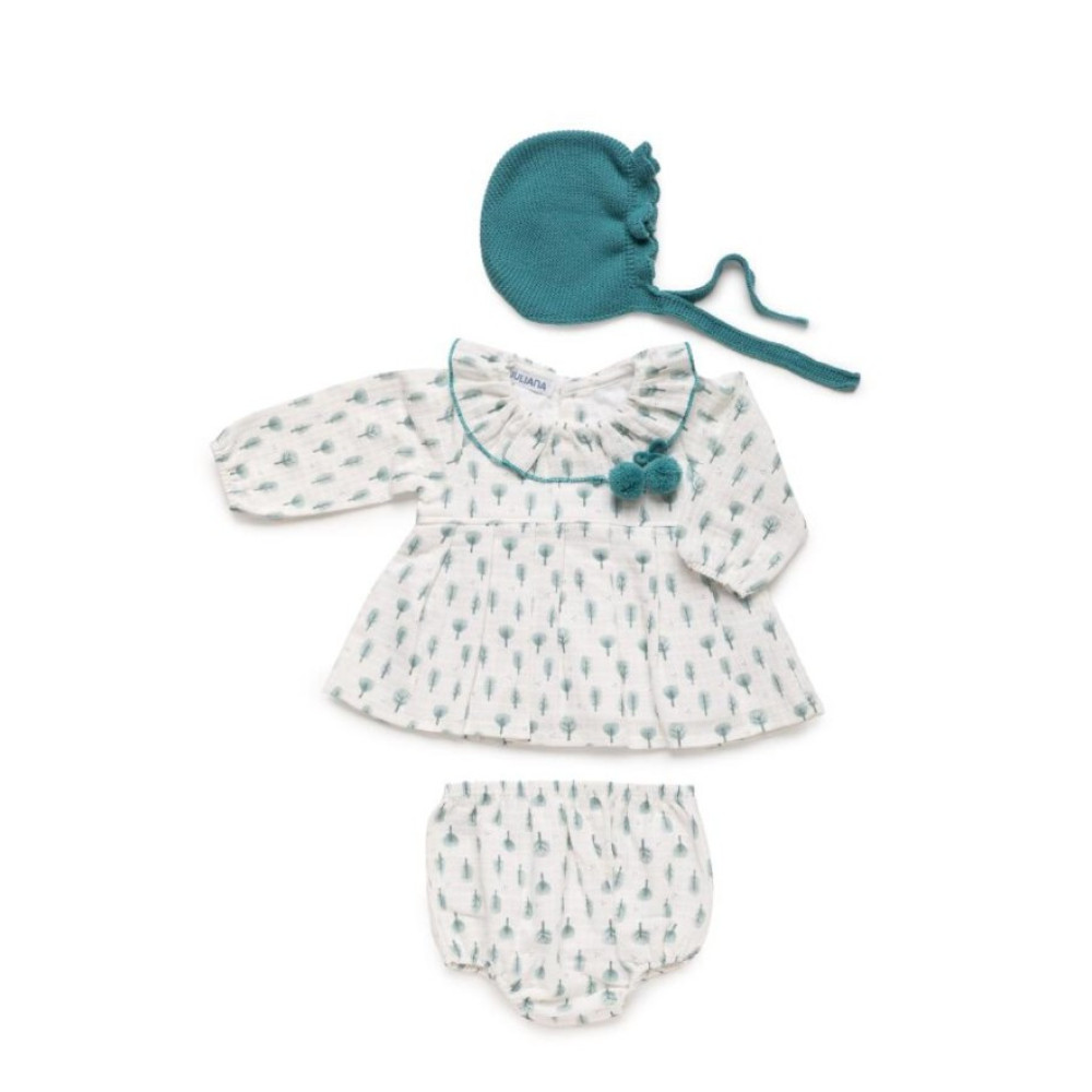 Jesusito estampado con motivos vegetales en verde báltico. Cuello volante con ribete a contraste y detalle de pompones en el pecho. Incluye ranita de tela gorro de punto a conjunto. Marca Juliana.