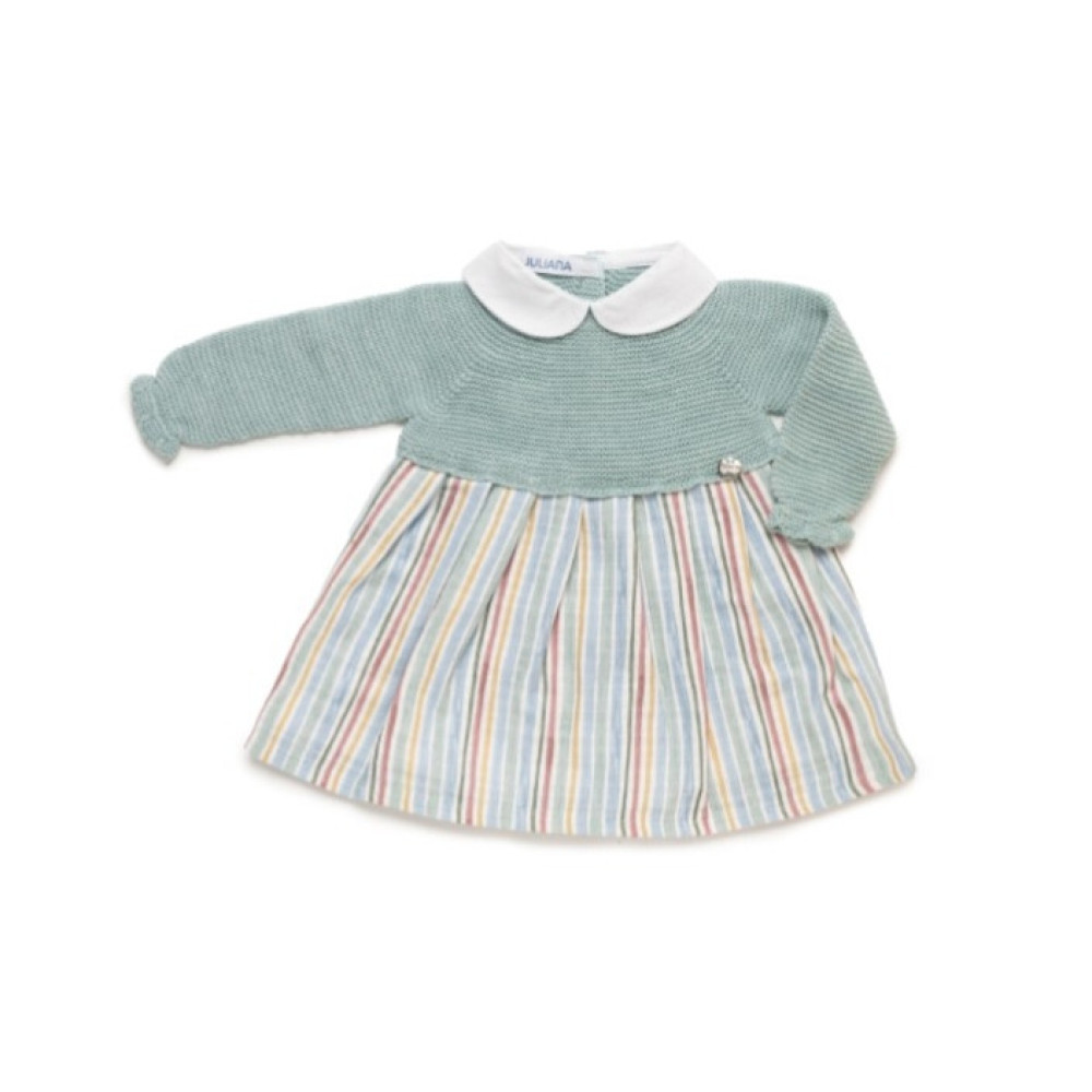 Vestido encantador con cuerpo de punto tricot y falda de tejido suave con rayas en tonos pastel. El cuello bebé de tela blanco aporta un aire clásico y elegante, perfecto para los primeros paseos. Marca Juliana.