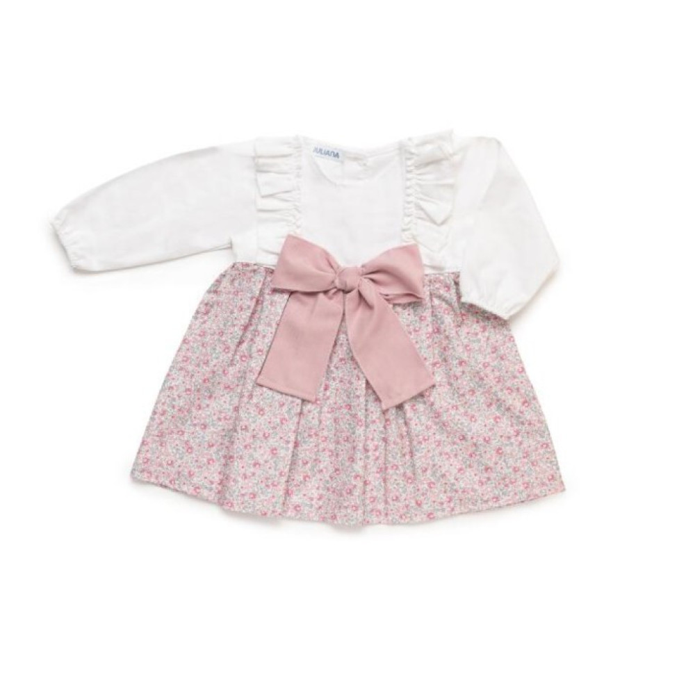 Vestido de manga larga con cuerpo de tela blanco y detalle de volantes en el delantero. La falda luce un delicado estampado floral en tonos maquillaje, rematada con un gran lazo central que aporta un aire romántico y atemporal. Marca Juliana.