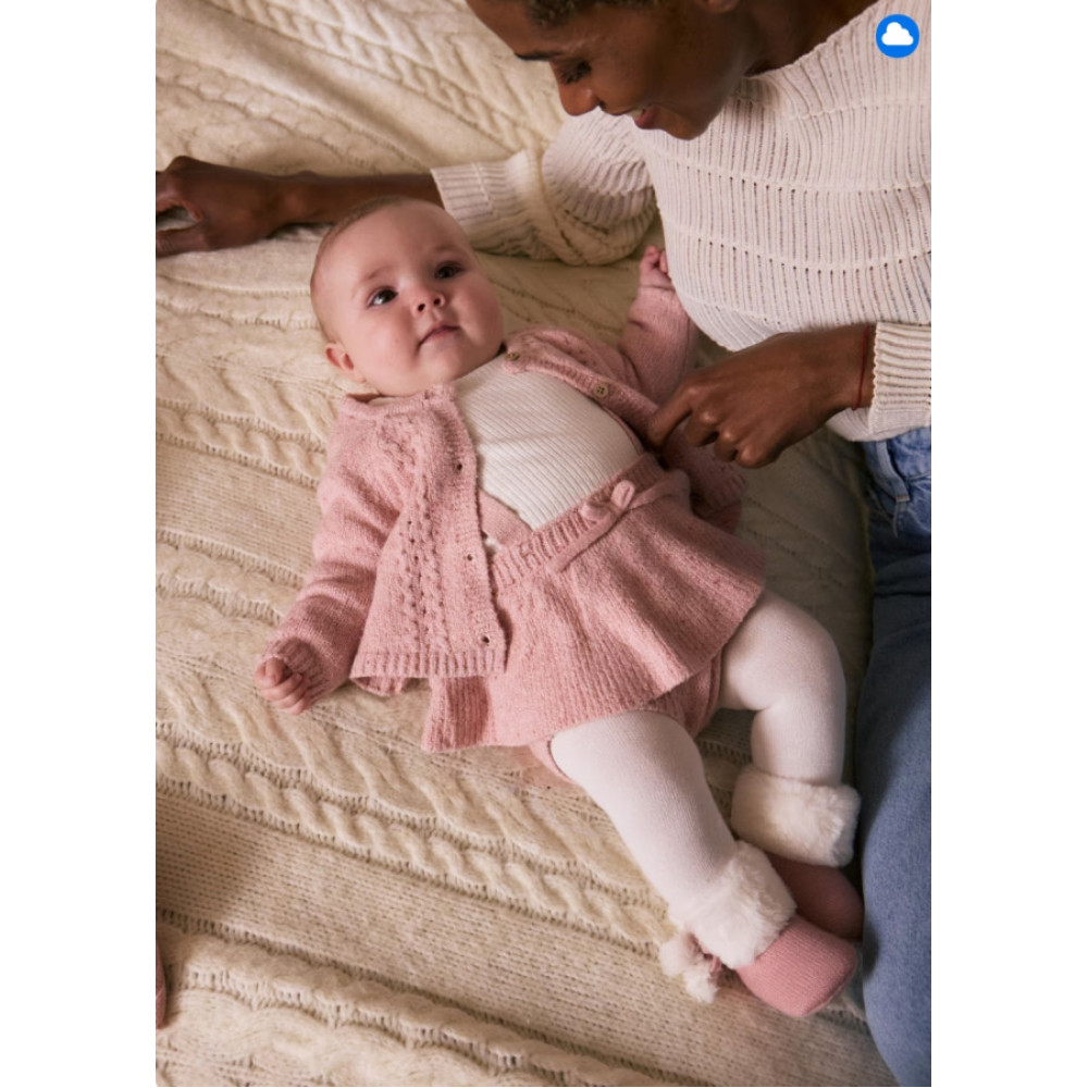 Conjunto tres piezas: chaqueta de tricot con botones delanteros, faldita con tirantes y camiseta de manga larga. Marca Mayoral.