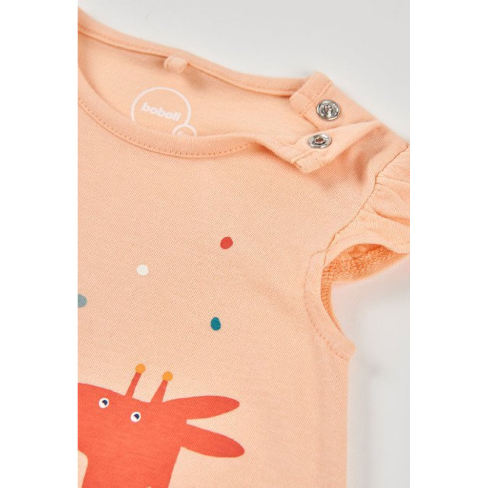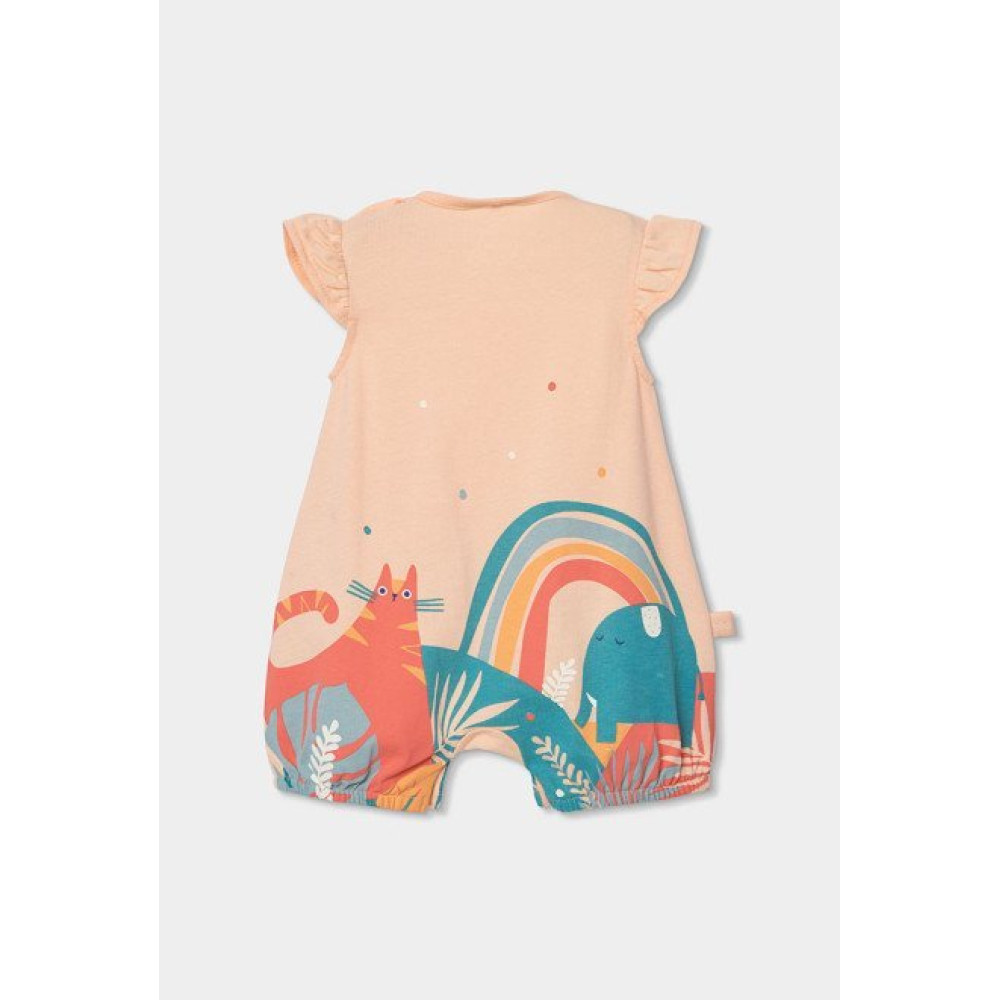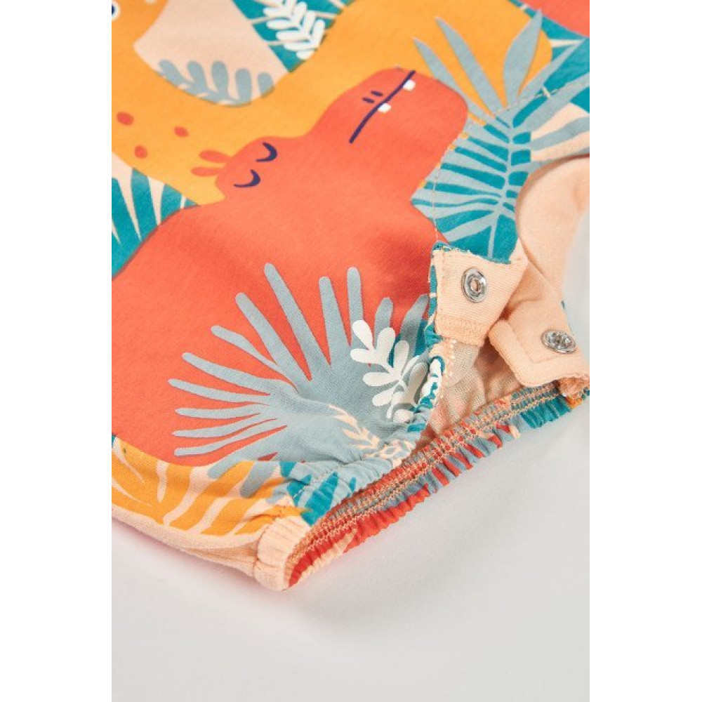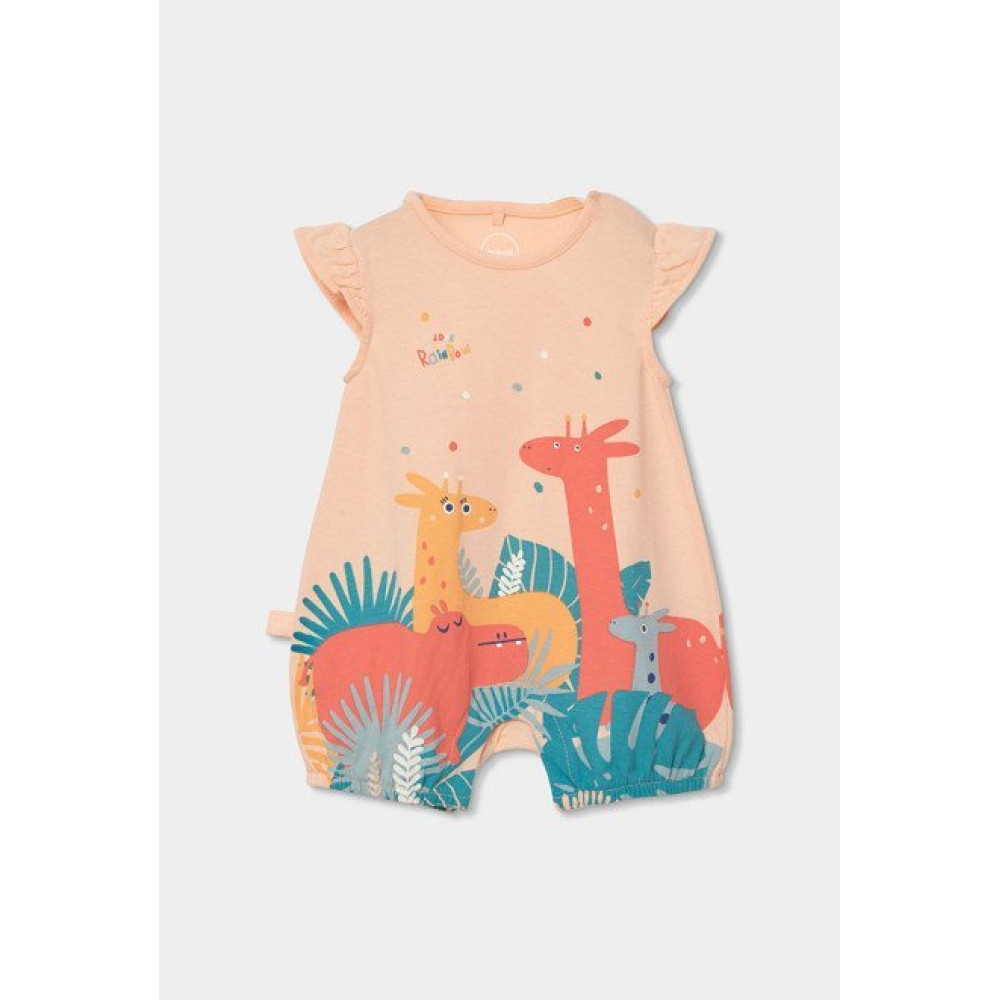 Pelele de punto con volante en hombros y estampado de animales divertido por ambas partes. Tiene botones de clip en hombro izquierdo y en la entrepierna para facilitar el cambio de pañal. Marca Boboli.